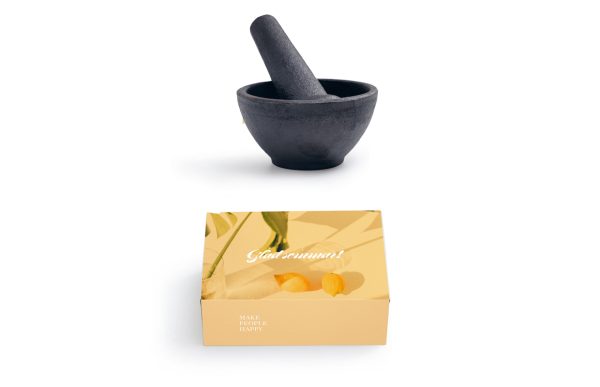 Mortel i gjutjärn, storlek 8,5cm i diameter och 4,5cm hög. Morteln kommer förpackad i en elegant giftbox som är förberedd för julkort i A7-format.
