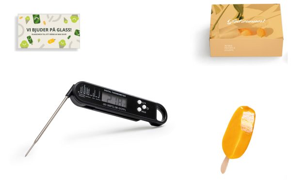 Termometern är 15cm lång och utfälld 26cm. Termometern ligger snyggt förpackad i kartong med sommarfeeling tillsammans med en sommarhälsning och två glasscheckar värda 60 kr.